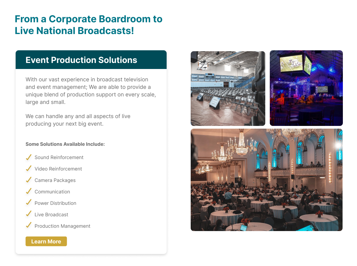 Whether itβs a meeting, tradeshow, ceremony, party or convention, our team will manage your next project so that you can sit back and have a good time!